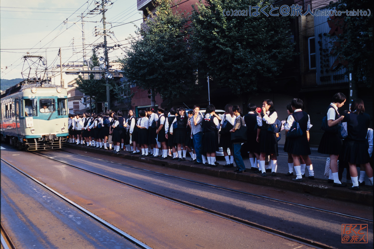 女子高生達でいっぱいとなったホーム。1993年ごろ撮影。 オリンパス OM-2+Zuiko28mm/f3.5 東山三条駅 京阪京津線 1993年頃撮影 列車種別, テーマ別, 秋の撮影, 路線別(私鉄), 京阪線・南海線・叡山線, 新快速・快速・普通列車, フィルム時代の頃 京津線, 京阪, 80型 旅路入線(大社にて) 電車到着(東山三条にて) 関連記事 ガンダム、発進! 夕刻の渋川俯瞰(渋川にて) ライトアップに照らされて(東松原にて) 特急「はくと」(泊にて) スーパーレールカーゴ(名神クロスにて) 河の都市(隅田川橋梁にて) 雪降る街(福井にて) 高槻遠望と「トワイライトエクスプレス」(高槻にて)