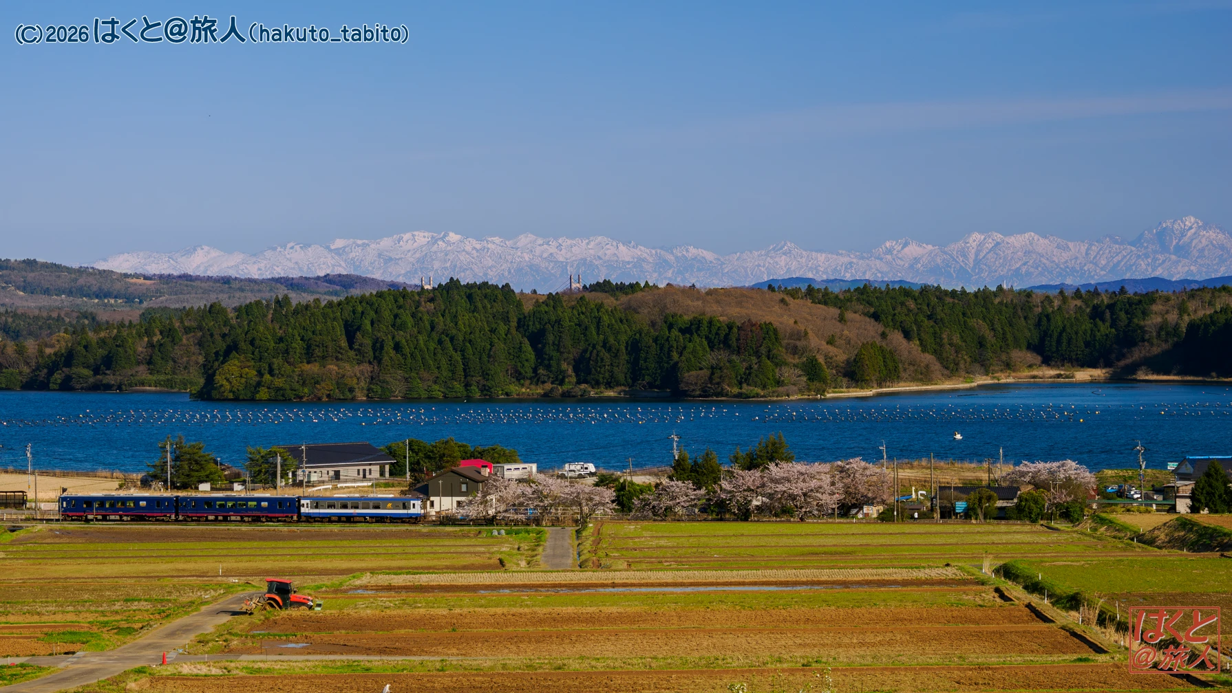 湯乃鷺駅に春の訪れ、遠くには立山連峰。新型コロナ流行下で運休を余儀なくされ、運行再開で再び活気をと目指した「のと里山里海号」が、令和6年能登半島地震発生時にこの605D列車で運行中に被災。あの日、西岸駅にたどり着けなかった観光列車が、「震災語り部観光列車」として、再び能登の地を走っておりました。